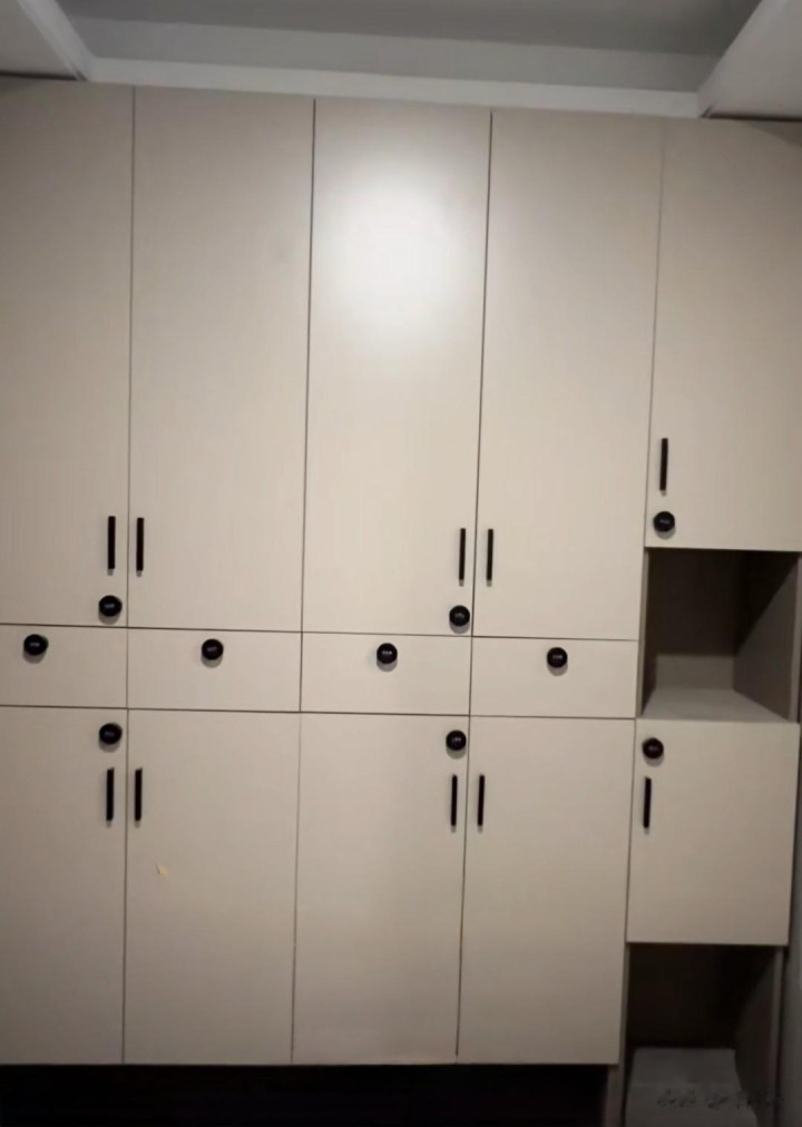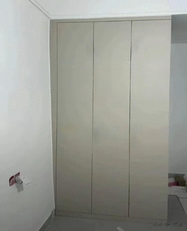 正所谓一门到顶,应把顶部外露的这根横向顶望板压在门板底下,就完美了。底部衣柜踢脚可保留,以免开门碰脚。