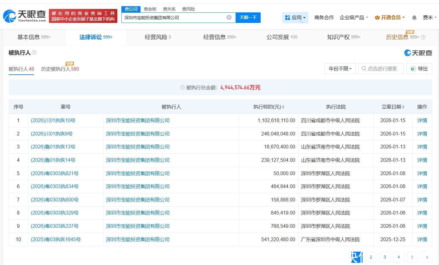 天眼查天眼风险信息显示金橘策略,1月15日,深圳市宝能投资集团有限公司、姚振华等新增两则恢复执行信息,执行标的13.4亿余元,执行法院为四川省成都市中级人民法院。