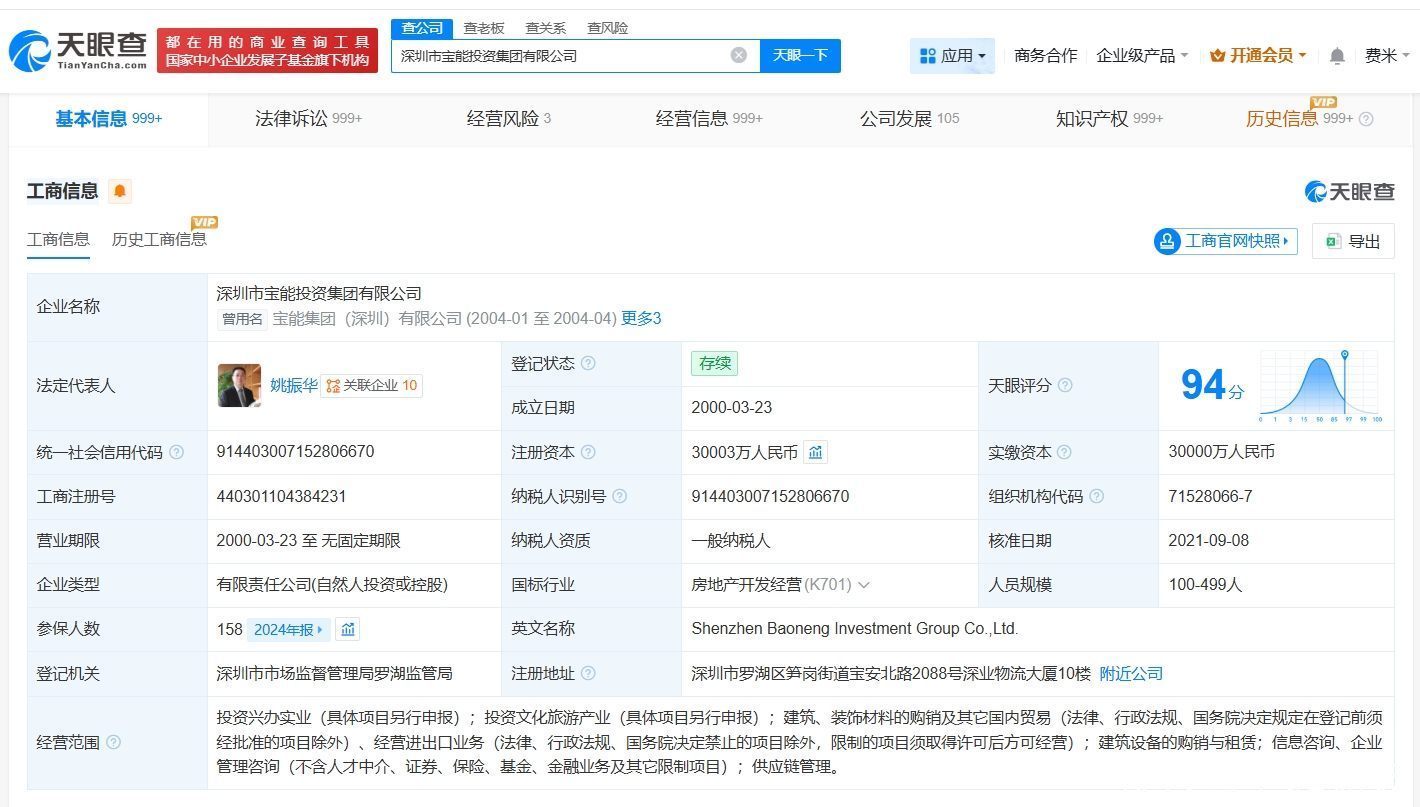 深圳市宝能投资集团有限公司成立于2000年3月,法定代表人为姚振华,注册资本约3亿人民币,经营范围包括投资兴办实业、投资文化旅游产业、经营进出口业务等。股东信息显示,该公司由姚振华、深圳赛康资产管理有限公司共同持股。